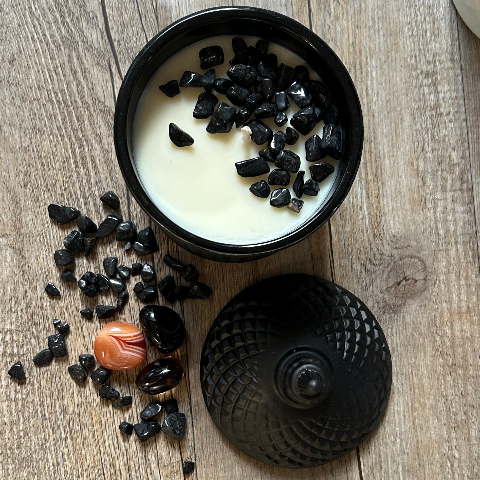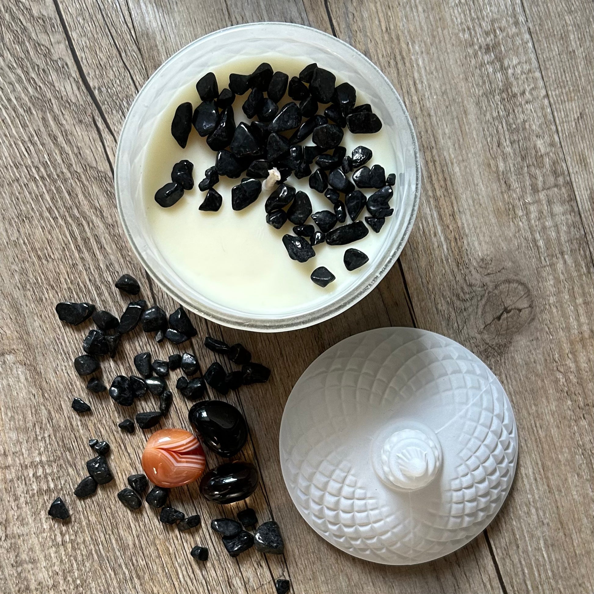 - 1 x Crystal infused (Black Tourmaline) Cupola Candle (White/Black) - approx. 60hrs burn time.
