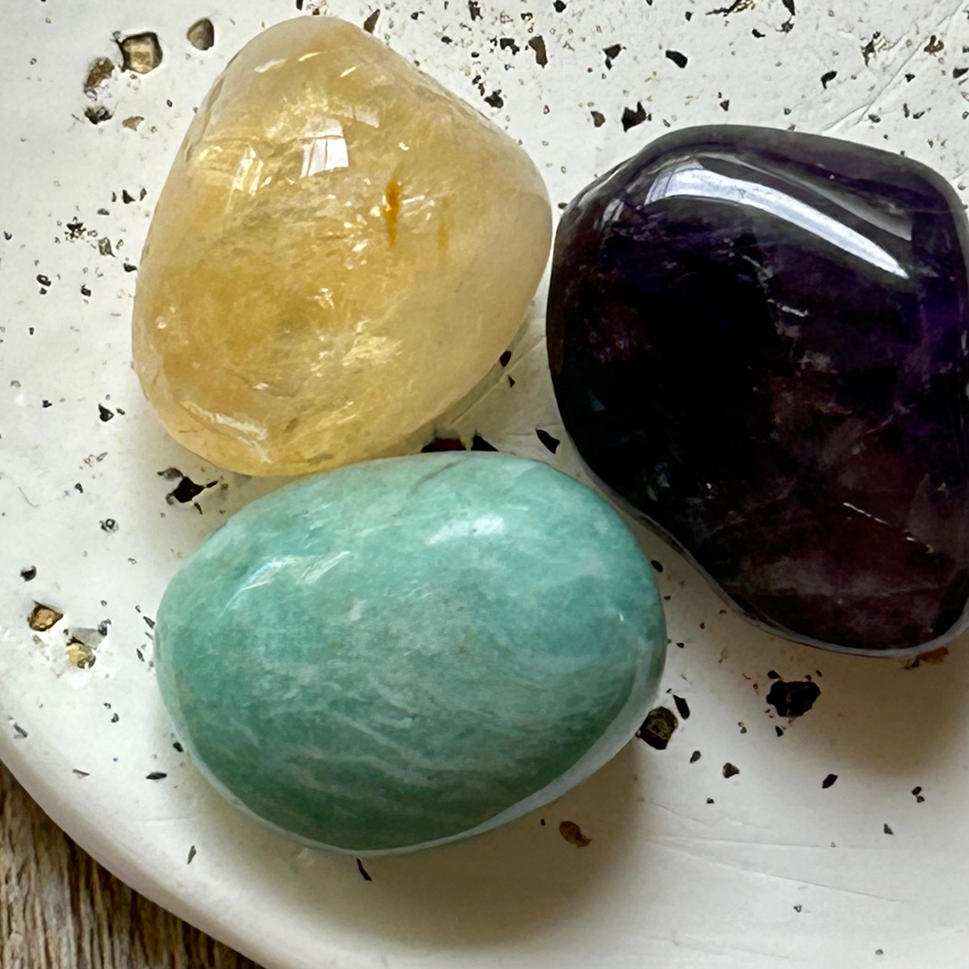 - 1 x Virgo Crystal Kit (includes 1 x Amazonite, 1 x Amethyst & 1 x Citrine Tumbled Stone).